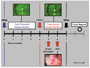 After identifying this relationship between ocular discomfort and TFBUT, the impact of blink rate on the TFBUT system was recognized. Studies have shown that the average blink rate is approximately 12 times per minute or once every 5 seconds. In an ideal TFBUT system in which the ocular surface is continually protected, the time to tear film destabilization should match or exceed the time to the next complete blink. In contrast, when the TFBUT and blink rate don't coincide, the ocular surface is temporarily unprotected. This results in a sensation of ocular discomfort followed by the development of superficial punctate keratitis (SPK). This discordance between TFBUT and blink rate can be worsened by factors that shorten TFBUT (such as keratoconjunctivitis sicca and systemic medications that cause ocular drying) or by factors that decrease blink rate (such as fatigue and visual tasking). The diagram on page 54 depicts an unfavorable TFBUT system that results in an unprotected ocular surface and exacerbated signs and symptoms of dry eye.