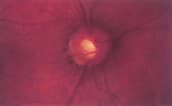 Examination/findings: Vision was 20/20 OU. Goldmann tonometry readings were 25 mm Hg and 17 mm Hg. The external exam was within normal limits. There was early afferent pupillary defect OD. Pachymetry showed corneal thicknesses of 512 microns and 507 microns. The slit-lamp exam revealed quiet conjunctiva; a faint LASIK scar was present; the iris was flat without transillumination defects; and the lens was clear.