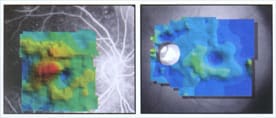 Left: An RTA 2-D map showing retinal edema. Center: An RTA 2-D map showing early glaucomatous thinning at the posterior pole. (The nerve head, omitted, is displayed on a separate map.) Right: An RTA posterior pole 3-D thickness map showing a macular hole. Note that all maps are overlaid on a fundus image to allow correlation of the thickness information with the retinal surface anatomy. |
