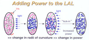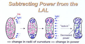 The "light-adjustable" silicone IOL, or LAL (being developed by Calhoun Vision in Pasadena, Calif.) can be made to change shape, and hence refraction, by exposing it to a specific wavelength of light. Adjustments can be made over a range of several diopters with remarkable precision. Animal studies conducted by Nick Mamalis, M.D., at the Moran Eye Center at the Universtiy of Utah, have shown that changes in refractive power can be controlled to ±0.2 D or less. And because the adjustment can be precisely customized, it's possible to adjust (or create) not only cylindrical correction, but multifocal correction, aspheric correction and higher-order correction.
