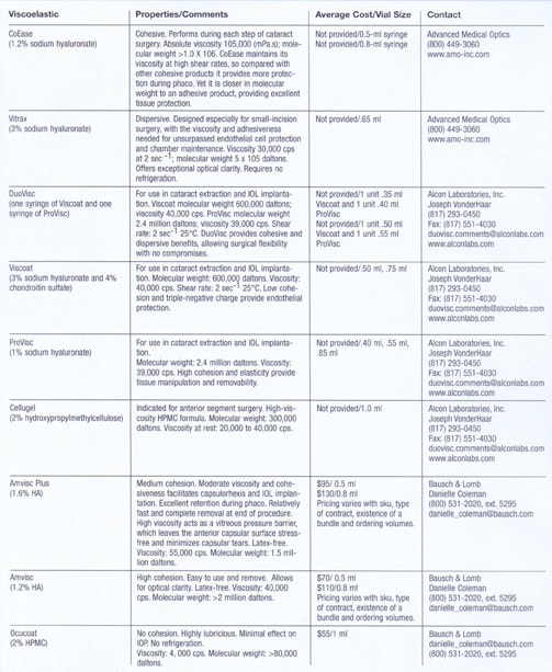 With so many new procedures emerging, including bimanual phaco, endocyclophotocoagulation, nonpenetrating glaucoma surgery, phakic IOLs, and refractive lens exchange, it's likely that new viscoelastic agents to complement them will be developed. In the meantime, for your convenience, we've listed today's state-of-the-art products here, with a focus on their uses in cataract surgery.