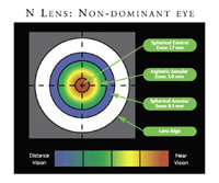 2.3 mm and 1.7 mm respectively. (Because the pupil constricts when focusing at near, a smaller near zone is just as effective as a larger distance zone. This also allows more distance coverage in the outer rings of the N lens, improving distance vision.)