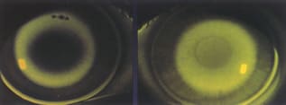 When fitting a lens to achieve corneal reshaping, the ideal lens will have a "doughnut" fluorescein pattern like the one on the left. The lens on the right is too steep and needs to be