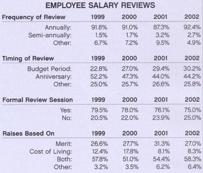 February 2003 Stat Tracker showed the national compensation averages for all medical practices as reported in the 2003 Staff Salary Survey. At right are the national averages for benefits and employee salary reviews as reported in the 2003 Staff Salary Survey.