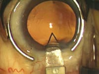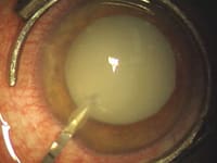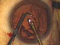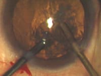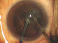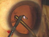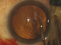 Second, the 20-gauge instruments can tend to stretch the incisions so they don't seal as well as the typical paracentesis. He's solved that by using a trapezoidal 1.2/1.4-mm diamond blade. And third, Dr. Chang thinks performing a capsulorhexis through the small incision can be tricky for some surgeons. He uses a bent 25-gauge needle with irrigation, but those more comfortable with forceps will find that part of the procedure a little more technically challenging.