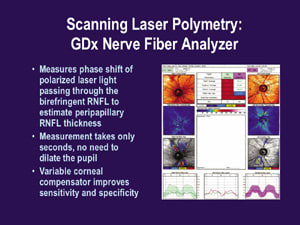 The GDX measures the phase shift of polarized laser light passing through the birefringent RNFL to estimate peripapillary RNFL thickness. This nonmydriatic system returns accurate measurements in only seconds. (See "Scanning Laser