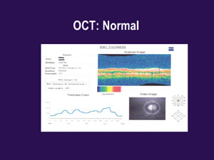 Another useful technology that tracks changes in the RNFL over time by storing still and video images is OCT. Built-in software automatically compares your patients' measurements against those stored in the OCT's normative database, producing charts or graphs that let you detect RNFL abnormalities at a glance. (See "OCT: Normal" and "OCT: Open Angle Glaucoma.")