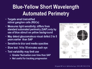 A type of short-wavelength automated perimetry (SWAP) (blue-yellow perimetry) targets small, bistratified retinal ganglion cells. (See "Blue-Yellow Short Wavelength Automated Perimetry.") Like SAP, this test measures light sensitivity. However, it uses blue stimuli on a yellow background and may detect glaucomatous visual defects 3 to 5 years earlier than white-on-white perimetry.7 Unfortunately, a complete blue-yellow perimetry test can take between 14 and 18 minutes, and the results may be compromised by media opacities.