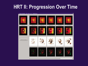 This technology uses a confocal scanning laser ophthalmoscope to create a three-dimensional image of the optic nerve and retina. High-definition images show diffuse and focal retinal nerve fiber layer defects. In contrast, ophthalmoscopic examination with red-free light identifies possible focal defects only. You can also use HRT to compute various disc parameters and determine changes in disc topography. Of the three systems discussed here, HRT offers the best topographic comparisons over time. (See