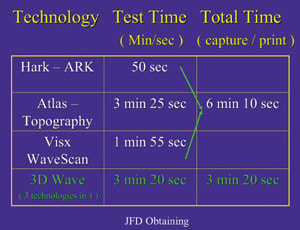 An integrated instrument is faster, as well. As illustrated by the chart on page 6, it takes 50 seconds from pushing the button on my autorefractor to having a hard copy in my hand. The topographer takes 3 minutes and 25 seconds, and the WaveScan (VISX) takes 1 minute and 55 seconds. The total -- 6 minutes and 10 seconds -- is nearly twice the 3 minutes and 20 seconds it takes to get all the same data with the Marco 3-D Wave. And the 3-D Wave offers nine measurements to help us plan our patients' treatments.