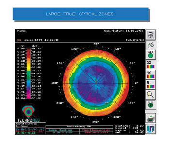 The Allegretto Wave takes into account the angle of the beam relative to the corneal surface. It uses a "wavefront-optimized" ablation profile -- an algorithm based on empirical wavefront research designed to optimize corneal asphericity -- that adjusts the number of spots being applied. The result is a more prolate cornea and an accurate, topographically visible optical zone that extends out to 6.5 mm. (See image, page 90.) Compensating for this factor also creates a smoother junction between treated and non-treated areas.