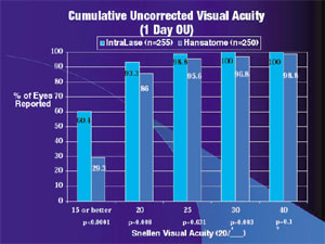 IntraLase-treated eyes at 1-day post-op surpassed those of eyes treated with the Hansatome