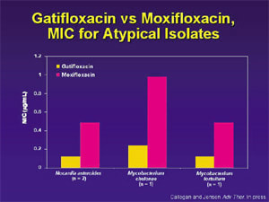 While evaluation of MIC values has its place, short of human studies, these animal studies are crucial to show the efficacy of these antibiotics. This is especially true when you have resistant organisms responding well clinically to fourth generation fluoroquinolones. This makes a very strong statement for the efficacy of these drugs. Although the epidemic of atypical mycobacteria may not end within the next couple of years, I predict it will be curtailed as fourth generation fluoroquinolones replace the third generation.