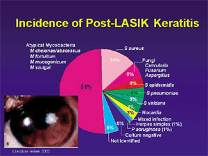 Because mycobacteria are becoming increasingly problematic in ophthalmic surgery, the New York Eye and Ear Infirmary did a study looking at mycobacteria that cause endophthalmitis and LASIK infections. This study showed that in the M fortuitum group, the fourth generation fluoroquinolones had the lowest MICs, and that in the M chelonae group, gatifloxacin had the lowest MICs.14