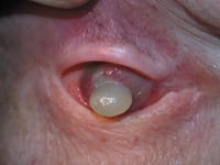 Patient with history of orbital squamous cell carcinoma presents with anterior tumor extension and crystalline lens extrusion. |