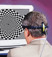 The test pattern is comprised of 58 zones alternating black to white, covering the central 30 degrees. During the test, the patient fixates on a target in the center of the screen, while a patented four-electrode cross placed on the back of the head monitors electrical activity to the brain.