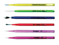 Surgeons are finding diamond knives superior to disposable metal blades for small-incision surgery. Pictured above is an Accutome diamond knife. An assortment of the company's Mani line of metal blades are pictured on the bottom. |