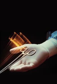 A retinal surgeon is preparing to perform 25-gauge vitrectomy. She can choose to use reusable end-grasping forceps and vertical scissors for the procedure, or the same instruments in single-use disposable form. She chooses the disposable instruments.