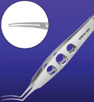 The Rosenwasser donor lamella inserting forceps was designed by George Rosenwasser, M.D., for inserting donor tissue during lamellar surgery. It features very thin vaulted shanks and a unique pre-calibrated heel stop. This design prevents the tips from completely closing, providing enough space to securely hold the folded endothelial tissue without crushing it.