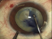 ►Next, paint trypan blue over the capsule (Figure 1). Use a tiny drop and eject it onto the capsule surface through a 27-gauge, hockey-stick cannula that is attached to a tuberculin syringe containing trypan blue. Paint the dye over the capsule surface using the distal ''blade'' of the hockey stick.