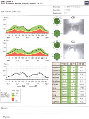 I want to first point out a normal OCT pattern. As you can see (Figure 1.) the nerve fiber thickness goes from thin to thick along the temporal retinal nerve fiber layer (RNFL) to superior RNFL to thin on the nasal RNFL then thick back to the inferior RNFL temporal-superior-nasal-inferior-temporal plot (TSNIT).
