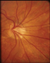 There were very atypical nerves on ophthalmoscopy. At first, looking at figures 2 and 3, you might think the slide is mislabeled. However, the disk is very tilted with the vessels exiting from the opposite side they normally do, or nasally. There was significant elevation of the nasal disk margin by biomicroscopy. The macula was ill defined. This appears to be a left disk in the right eye, or situs inversus, but it is probably a significant tilt.