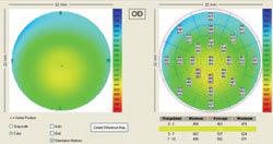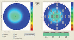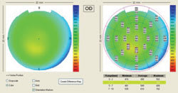 The Visante OCT maps corneal thickness in 25 spots across the cornea and has great repeatability (Figure 1). It can also create a differential map to compare past readings and detect subtle changes involved in corneal-thinning conditions. This can be very useful in following a patient with keratoconus or pellucid marginal degeneration (Figures 2a-b).