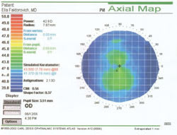 Figure 2a (top). Corneal topography of a patient with pellucid