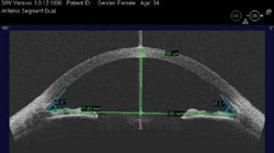 With the OCT scan, the user can visualize the angle in multiple cross-sections of the anterior chamber. Because the OCT uses infrared light, the pupil does not constrict, providing a more natural view of the angle without changing its anatomy. A measuring tool can then be used to calculate a definitive angle depth in degrees. Now, patients at risk for angle-closure glaucoma may be monitored more closely as the crystalline lens matures. Additionally, bowing of the iris can be visualized to better predict the efficacy of the peripheral iridotomy. An image of the angle may also make you feel more at ease about dilating a patient whose angles may appear borderline narrow on slit lamp exam and gonioscopy. The scan is detailed enough to even visualize Schlemm's canal and its patency or evaluate trabeculectomies.