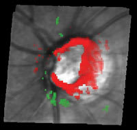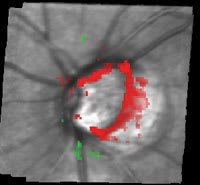 The most powerful predictor of glaucoma was the Moorfields Regression Analysis (MRA), which measures rim area and adjusts for optic disc size to determine if the eye is in the normal range. Remarkably, in some cases, the MRA was abnormal on Heidelberg Retinal Tomography (Heidelberg Engineering, Vista, Calif.) several years before any defect was detected by visual field testing or by evaluation of good quality stereo-photographs by an expert reading center. It is likely that the ocular hypertensives with an abnormal HRT at baseline already in fact had glaucoma, but at enrollment were thought to be normal, based on a normal visual field and a "normal" appearing optic disc.