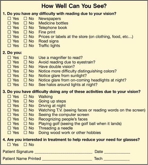 We fill out a How Well Can You See? (Figure 1) form with each cataract patient. It requires yes or no answers to simple questions about difficulty experienced with everyday activities. It is a concise and efficient method for obtaining specific information about the patients vision.