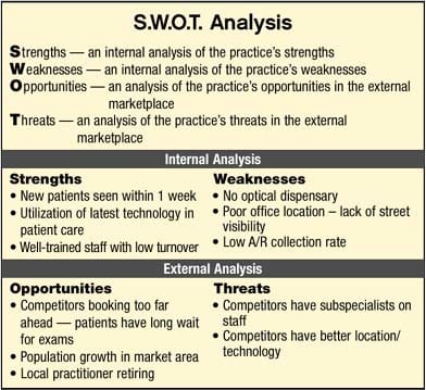 There are several business analytical tools available to help ophthalmologists review their practices and plan for the future, with one of the most commonly used being the strength, weaknesses, opportunities and threats (SWOT) analysis (see Table). It is a simple tool designed to assist you in analyzing your business internally and externally. In a SWOT analysis you critically examine the internal strengths and weaknesses of your practice and externally identify the threats and opportunities in your market area. The resulting answers will help provide a picture of what the practice is doing right and where it may need to make changes.