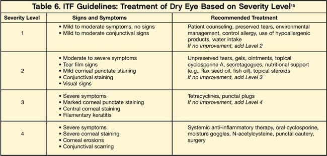 ■ Dry eye therapies. Specific therapies for dry eye include artificial tears, prescription therapies and surgery. The ITF recommends artificial tears as a starting point, and adding other therapies as needed based on symptom severity (Table 6).15 I have found these guidelines to be of value, though they are somewhat conservative as to when to start treatment. In practice, eyecare professionals often deal with the question of when to start treatment and who decides the physician or the patient? Some patients are very uncomfortable with even minimal symptoms, whereas others accept more severe symptoms. I believe the best approach is for the doctor to discuss with the patient and come to a joint decision.
