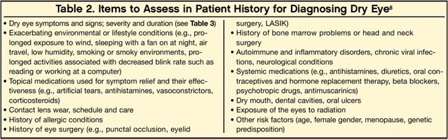 The patient history should attempt to capture the patients specific symptoms, as they can vary greatly (Table 3). Physicians can use standard questionnaires such as the McMonnies Dry Eye Index, the Ocular Surface Disease Index, the Dry Eye Questionnaire and the National Eye Institute Visual Function Questionnaire 25. It is important to recognize that each patient may describe the same symptom or sensation differently. Additionally, many patients with dry eye experience visual fluctuations, which is often overlooked.