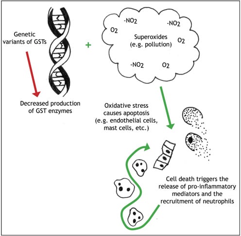 Glutathione-S-transferases (GSTs) are enzymes that use the products of oxidative stress as substrates, thus protecting cells from the damaging effects of reactive oxygen species (ROS). ROS are produced through the activation of mast cells, eosinophils, macrophages and neutrophils — all of which are involved in the pathogenesis of asthma and allergy. Each class of GST enzyme — mu, theta, and pi — preferentially metabolizes a specific ROS product.13