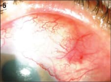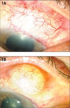 The most important step in the management of a failing bleb is to recognize its presence. Bleb failure is preceded by a gradual increase in IOP and a change in the bleb's appearance. On slit lamp examination, the bleb can appear less diffuse, less elevated or flat or relatively avascular and opalescent. Alternatively, it can also appear very elevated and surrounded by a fibrotic vascular ring. The latter description characterizes the appearance of a Tenon's cyst or encapsulated bleb (Figure 1A and 1B). When evaluating bleb function, the physician must observe the bleb's overall appearance and look for microcysts, which indicate good filtration. These are easier to see with fluorescein stain. It is also important to measure IOP and to evaluate if pressure decreases after digital ocular pressure (DOP) is performed.