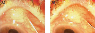 Figure 3A. Needling procedure. A 25-gauge needle is introduced bevel up into the bleb and is directed towards the posterior border in an attempt to dissect the episcleral fibrosis. Figure 3B. The needle is moved back and forth repeatedly.
