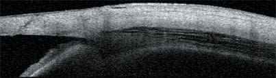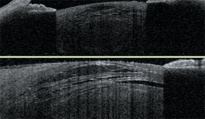 The Visante OCT has other advantages over UBM as well. It is wide-field versus narrow-field, and the patient can be sitting, rather than supine, during imaging. But unlike UBM, the current version of the Visante OCT uses 1310-nm light, which is blocked by pigment. However, the nonpigmented opaque ocular structures are permeable, and images can be obtained through a cloudy or white cornea, the conjunctiva and the sclera.