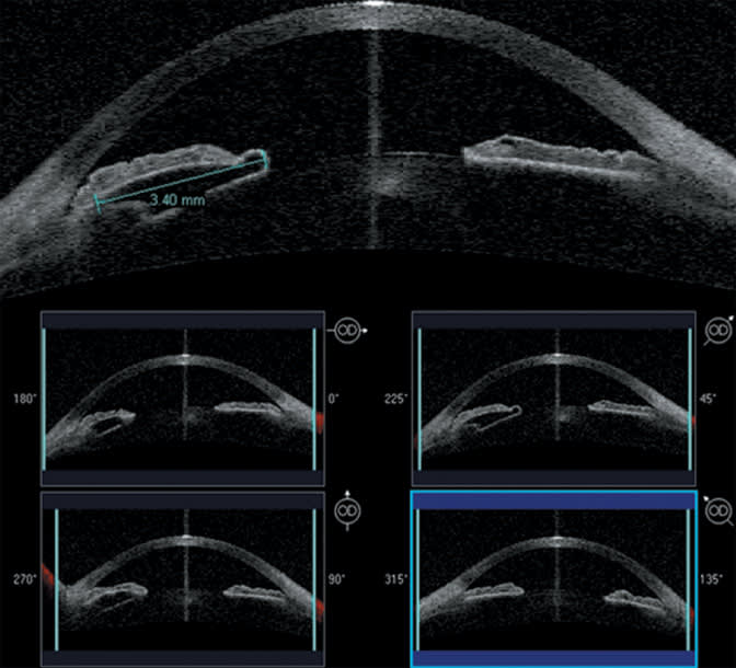 Compared with ultrasound biomicroscopy (UBM), the noncontact OCT instrument is easier to use and acquires images more rapidly. A technician easily can learn to operate the device, including selecting the axis to examine or performing an automatic examination along the four meridians. Each screen and printout specifies right or left eye, and a triangular icon (nose) helps the operator remain oriented. An arrow indicates the direction of the cross-section, and the degree area — e.g., from 0° to 180° — it covers is listed.