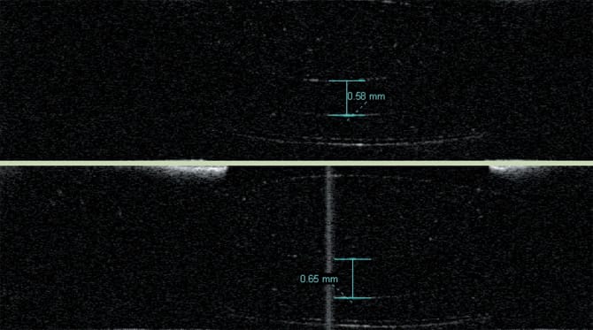 Visante OCT measures the space between the front and back optics of the Synchrony dual-optic accommodating IOL. The two different values, 0.58 mm and 0.66 mm, indicate that the optics are, indeed, moving.