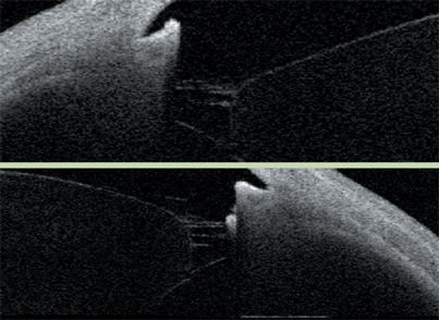 This image shows an anterior-chamber angle as viewed with gonioscopy and the Visante OCT. The latter replaces subjective evaluation with objective measurement.