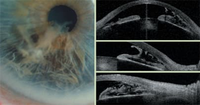 This image shows peripheral anterior synechiae on gonioscopy and the Visante OCT.
