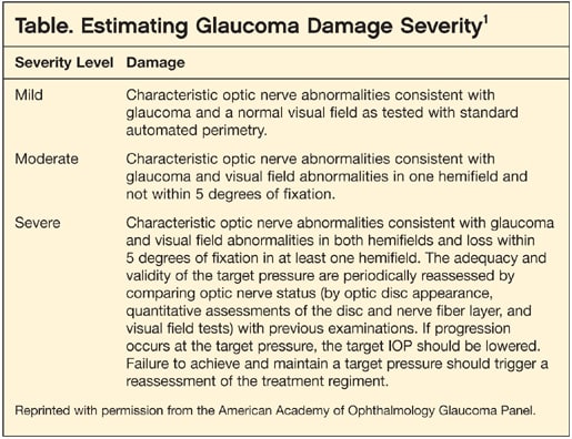 What should the target IOP be? As recommended by the AAO, we should assume that the pretreatment pressure range has contributed to optic nerve damage and is likely to cause additional damage in the future. The "target pressure" is then set at least 20% lower1 — although most clinical trials support a reduction of at least 30%. Even greater reduction may be justified based on the severity of existing optic nerve damage (Table) and its rate of progression, the pretreatment level of IOP and other patient risk factors. The AAO also recommends that if progression occurs at the target IOP, it should be lowered further. Failure to achieve and maintain a controlled target IOP should trigger reassessment of the treatment.