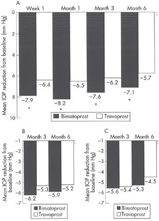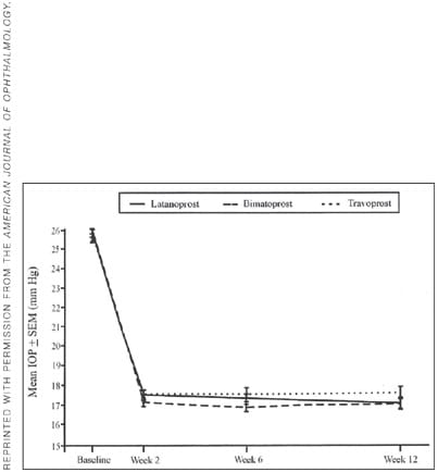 Not all studies have shown greater IOP reduction with bimatoprost compared to the other prostanoids. Parrish and colleagues50 conducted a 12-week, parallel-group study in 410 previously treated patients with POAG or ocular hypertension and IOP >23 mm Hg. After a washout period, the patients were randomly assigned to q.i.d. treatment in one or both eyes with bimatoprost 0.03%, travoprost 0.004% or latanoprost 0.005%.