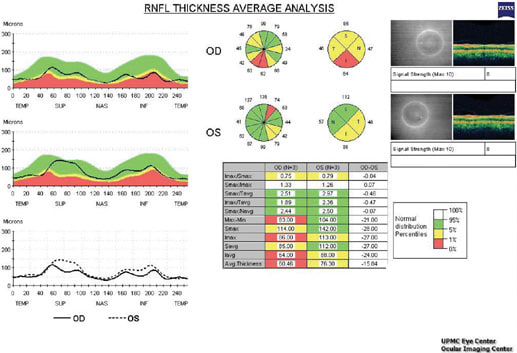 Figure. OCT analysis of nerve fiber layer shows thinning inferiorly in the right eye greater than the left eye.