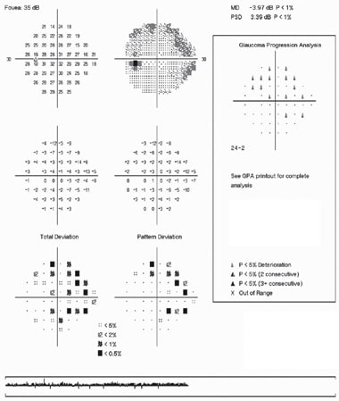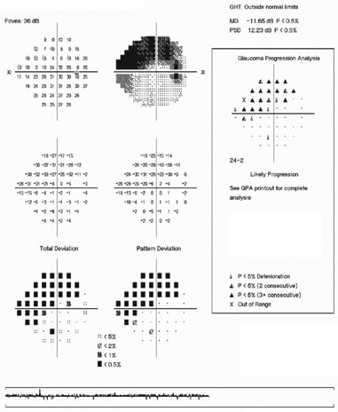 In January 2006, he showed some evidence of progression of his right visual field as measured by progression analysis (Figures 2 and 3). His IOPs remained at about 14 to 16 mm Hg. Given these results, we switched the patient from latanoprost to bimatoprost 0.03% (Lumigan, Allergan) one drop daily without incident. After 3 weeks, his IOP decreased further to 11 mm Hg initially. With continued follow-up at 3-month intervals, his IOPs ranged between 11 to 13 mm Hg. He continued to do well on bimatoprost with no changes evident on imaging or the visual field tests done at 6-month intervals. The patient continues to tolerate bimatoprost well.