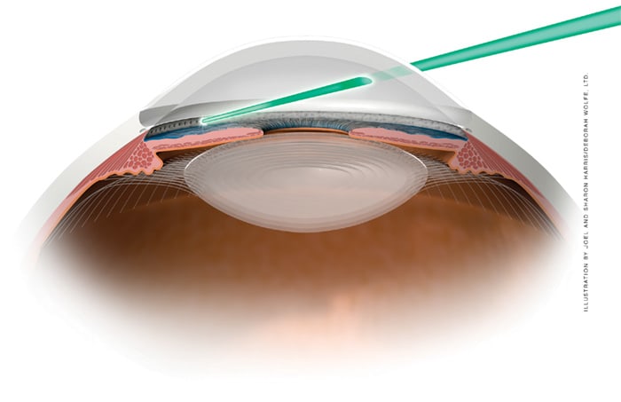 Figure 1. Laser trabeculoplasty: Representation of laser beam penetrating trabecular meshwork.