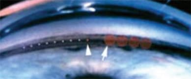 Figure 4. ALT spot size (left arrow) vs. SLT spot size (right arrow) in trabecular meshwork.