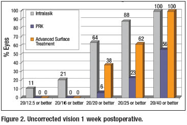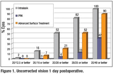 Visual recovery after AST is slower than with LASIK, but much faster than with PRK. At the 2006 European Society of Cataract and Refractive Surgeons meeting, Stephen G. Slade, M.D., and Daniel S. Durrie, M.D., presented a contralateral eye study comparing their results for alcohol-assisted PRK and LASIK. For both groups, they used the latest Alcon CustomCornea wavefront technology (Fort Worth, Texas). The LASIK flaps were created with the 60-kHz IntraLase femtosecond laser (IntraLase Corp., Irvine, Calif.). Not surprisingly, the LASIK early postoperative VA results were far superior to the PRK results, with 52% of LASIK (IntraLase) eyes achieving 20/20 on the first postoperative day, compared to only 4% of PRK eyes. At one week, 64% of LASIK eyes were seeing 20/20, compared to about 6% of PRK eyes.