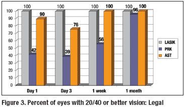 When I compare my latest AST results, using the Epi-K and the Carl Zeiss Meditec MEL 80 laser (Dublin, Calif.), to the Slade-Durrie data, one can see that while the early VA results fall short of LASIK, the 20/20 rates for AST are five times better than PRK on the first postop day (Figure 1) and six times better than PRK at 1 week postop (Figure 2). The percentage of AST patients who achieve 20/40 or better vision — the legal threshold for driving — is 90% at one day and 100% at 1 week, very similar to the 20/40 rates for LASIK and far better than the 20/40 rates for PRK (Figure 3).